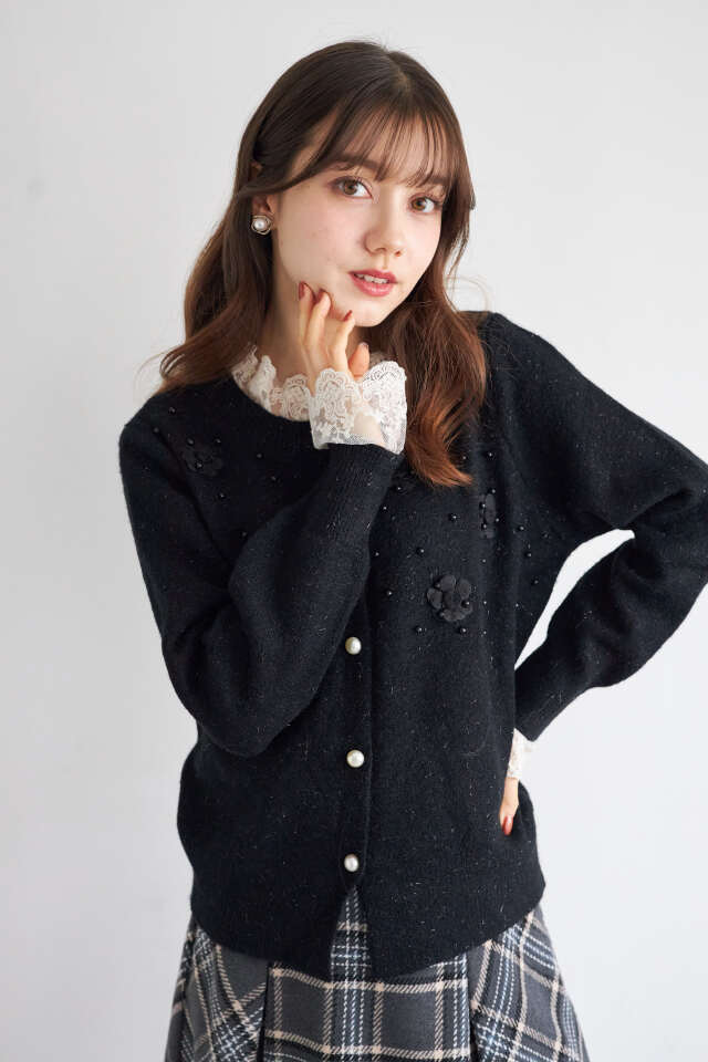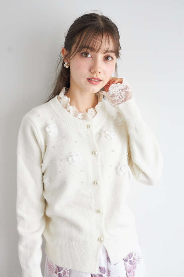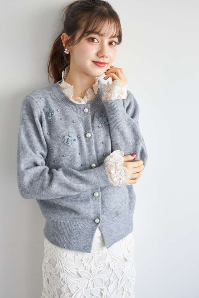 レース×パール×フラワー装飾ニットカーディガン