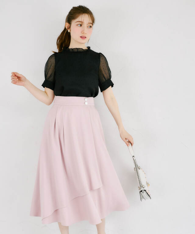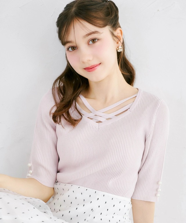 レディ感とセクシーさを併せ持つ袖口パール付きアシメリブニットプルオーバー