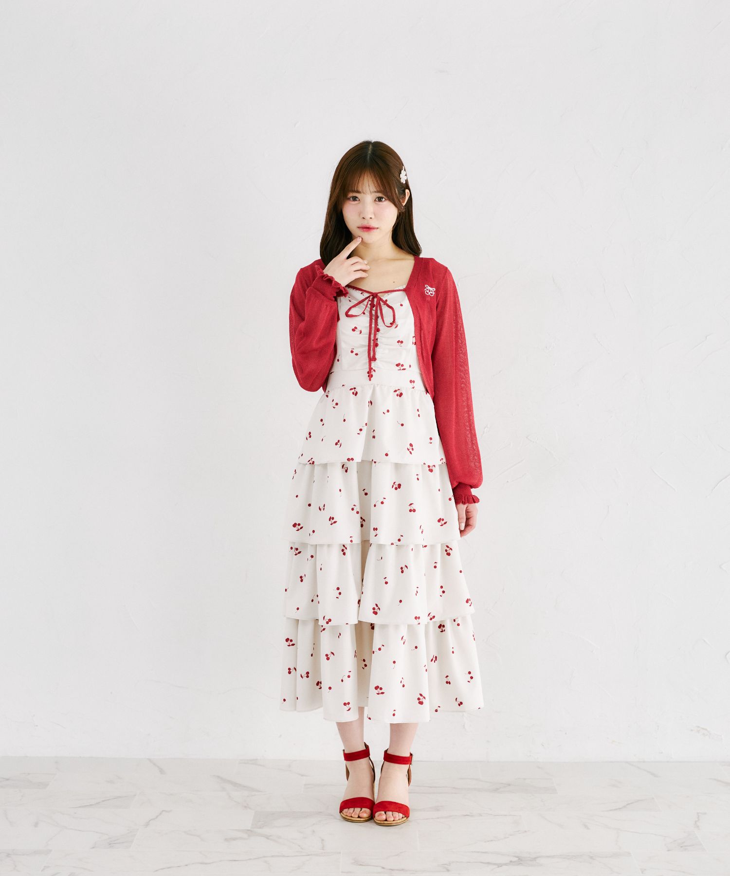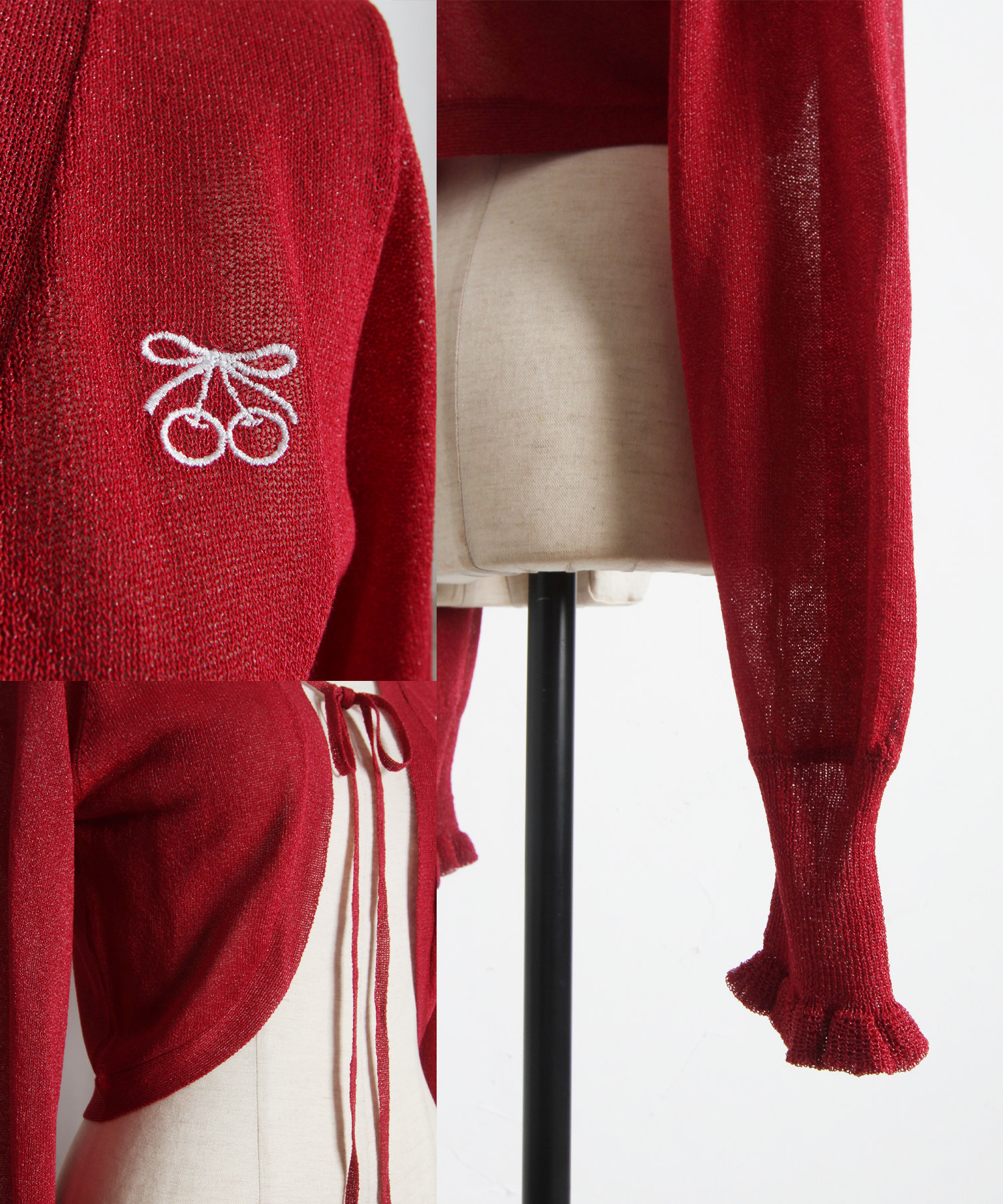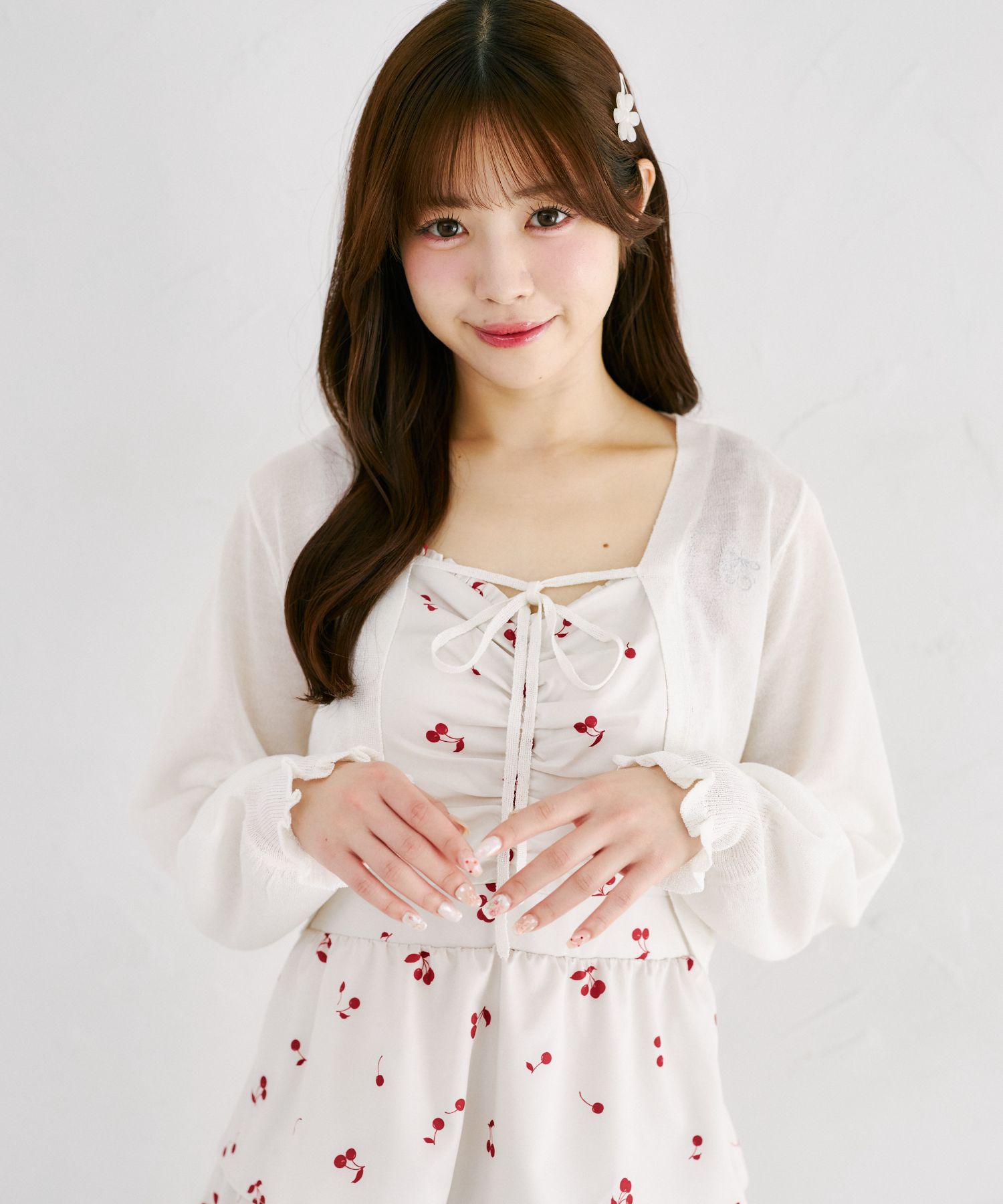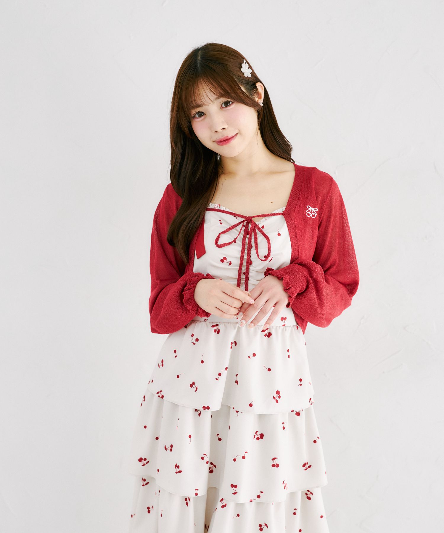 フロントのリボン、胸元のチェリー刺繍、袖口のフリル、