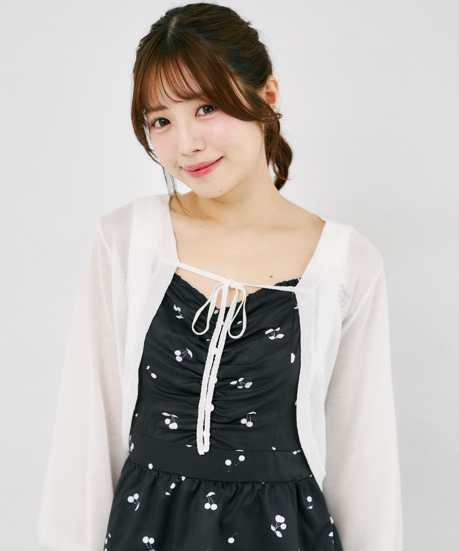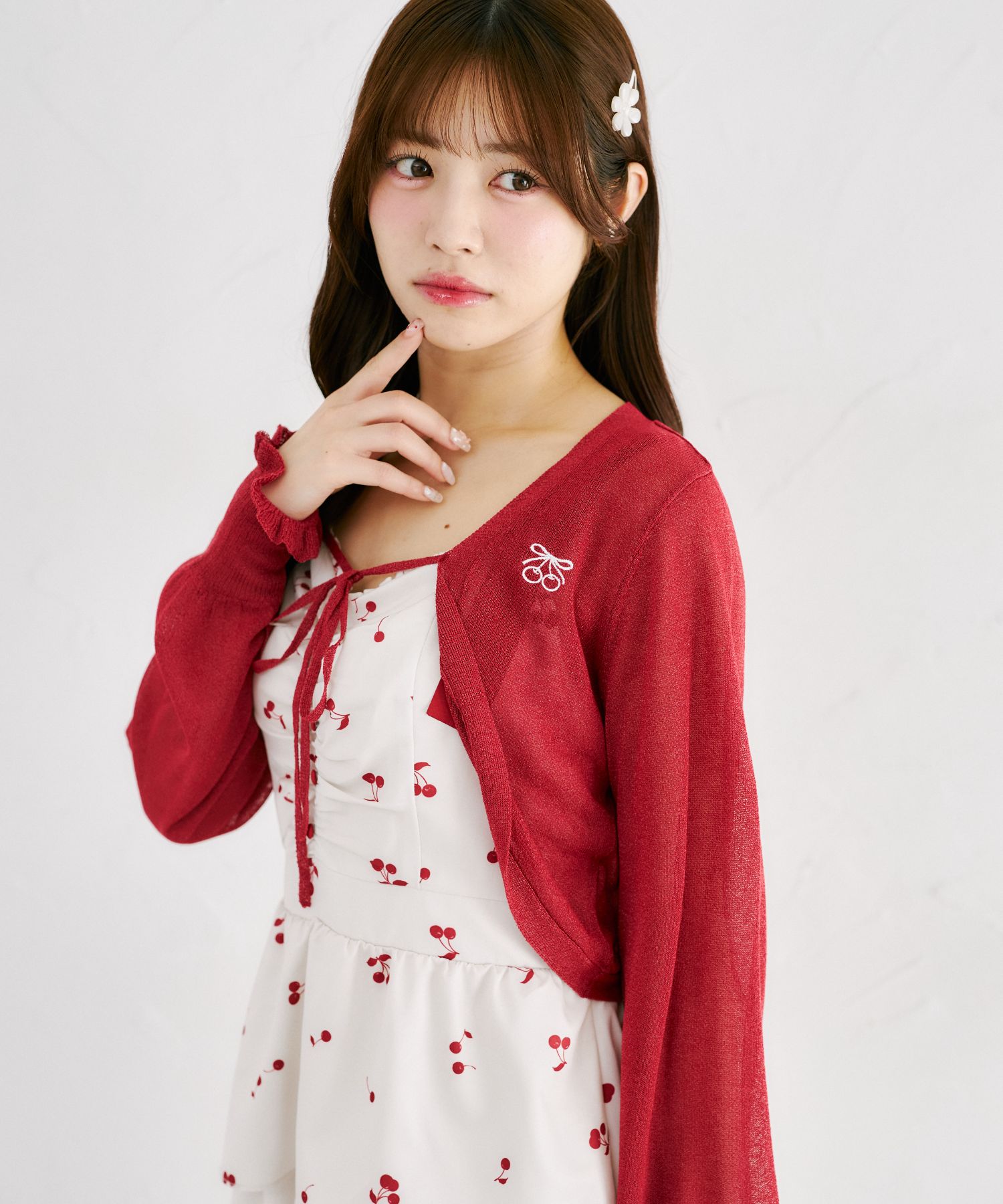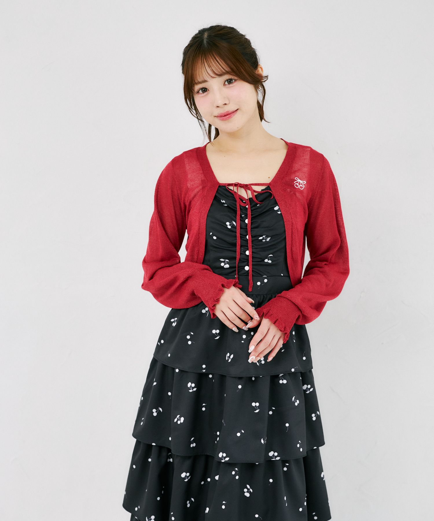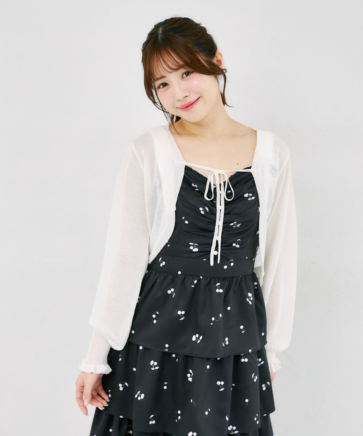 フロントのリボン、胸元のチェリー刺繍、袖口のフリル、