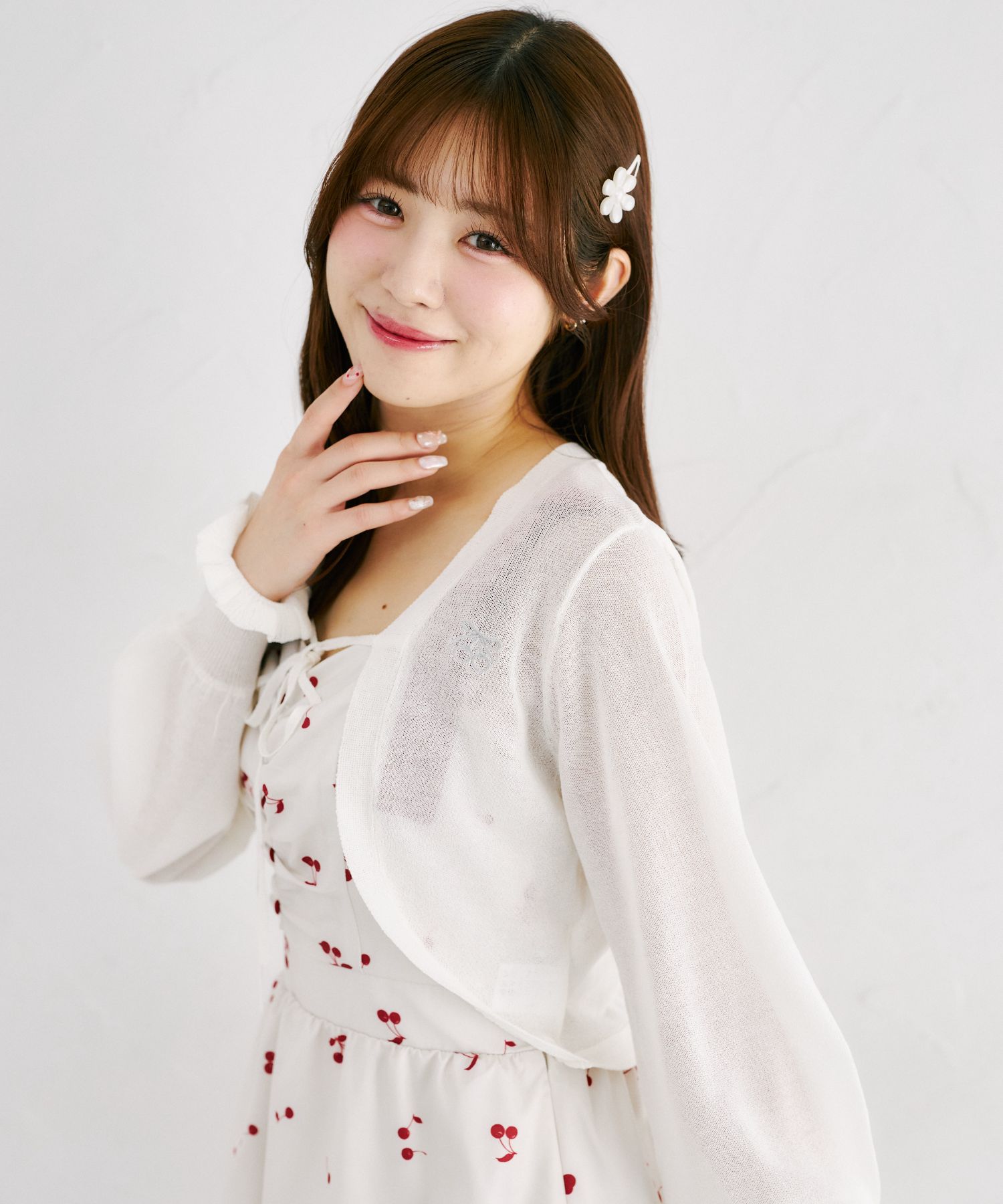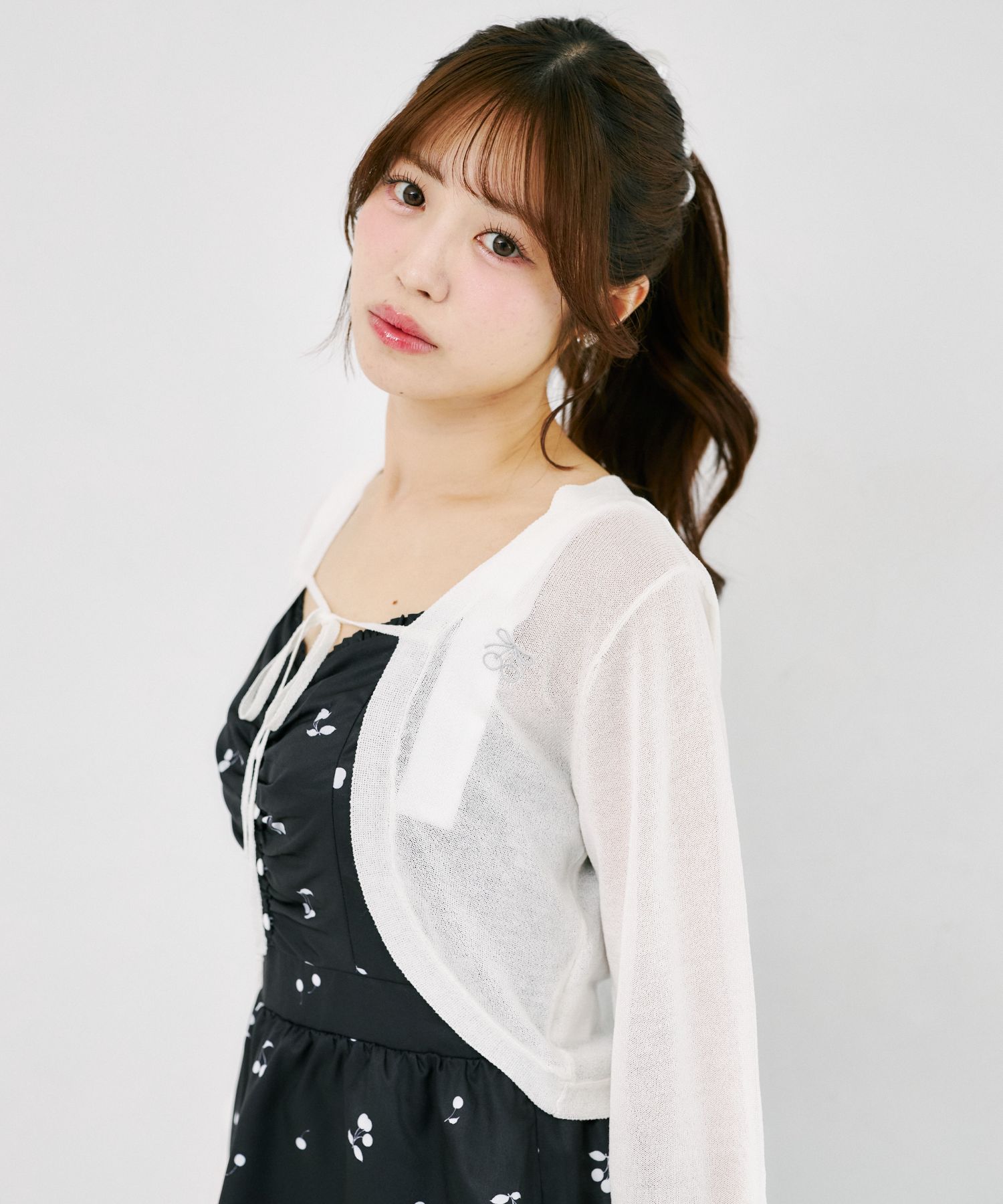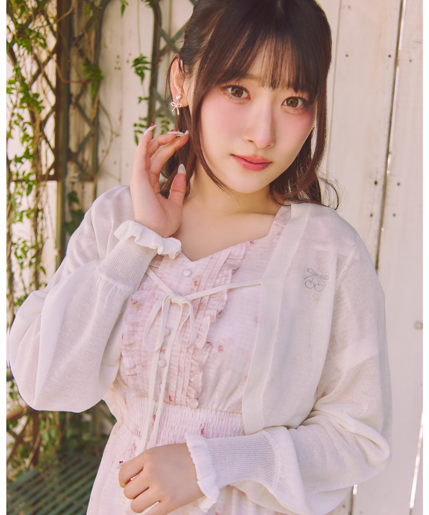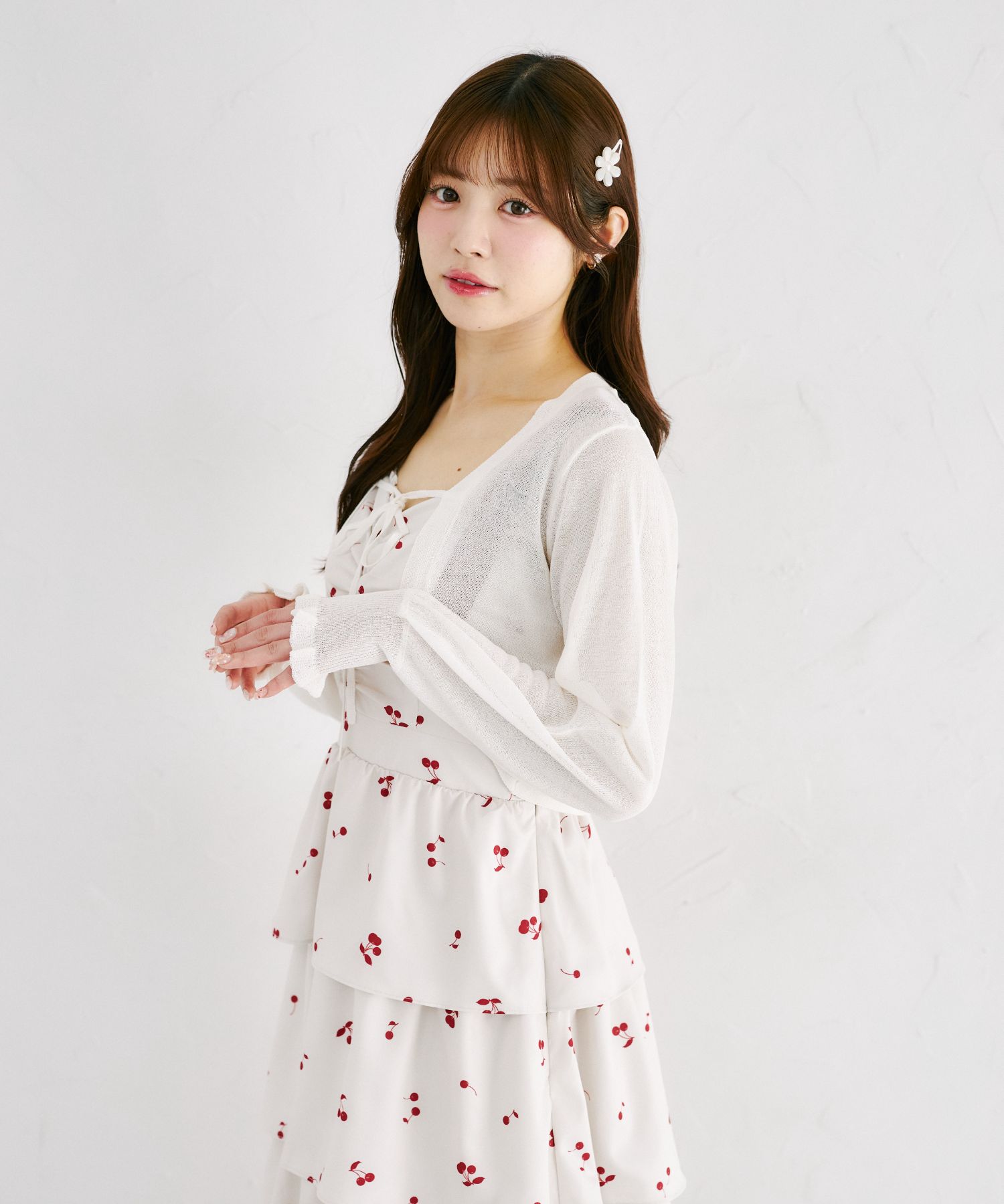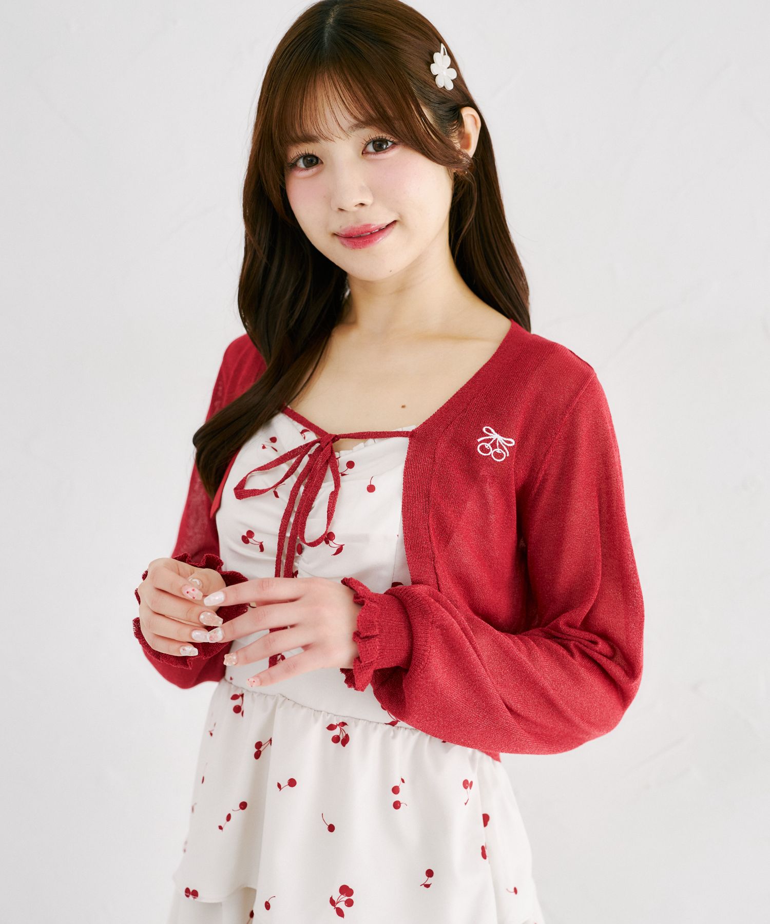 フロントのリボン、胸元のチェリー刺繍、袖口のフリル、