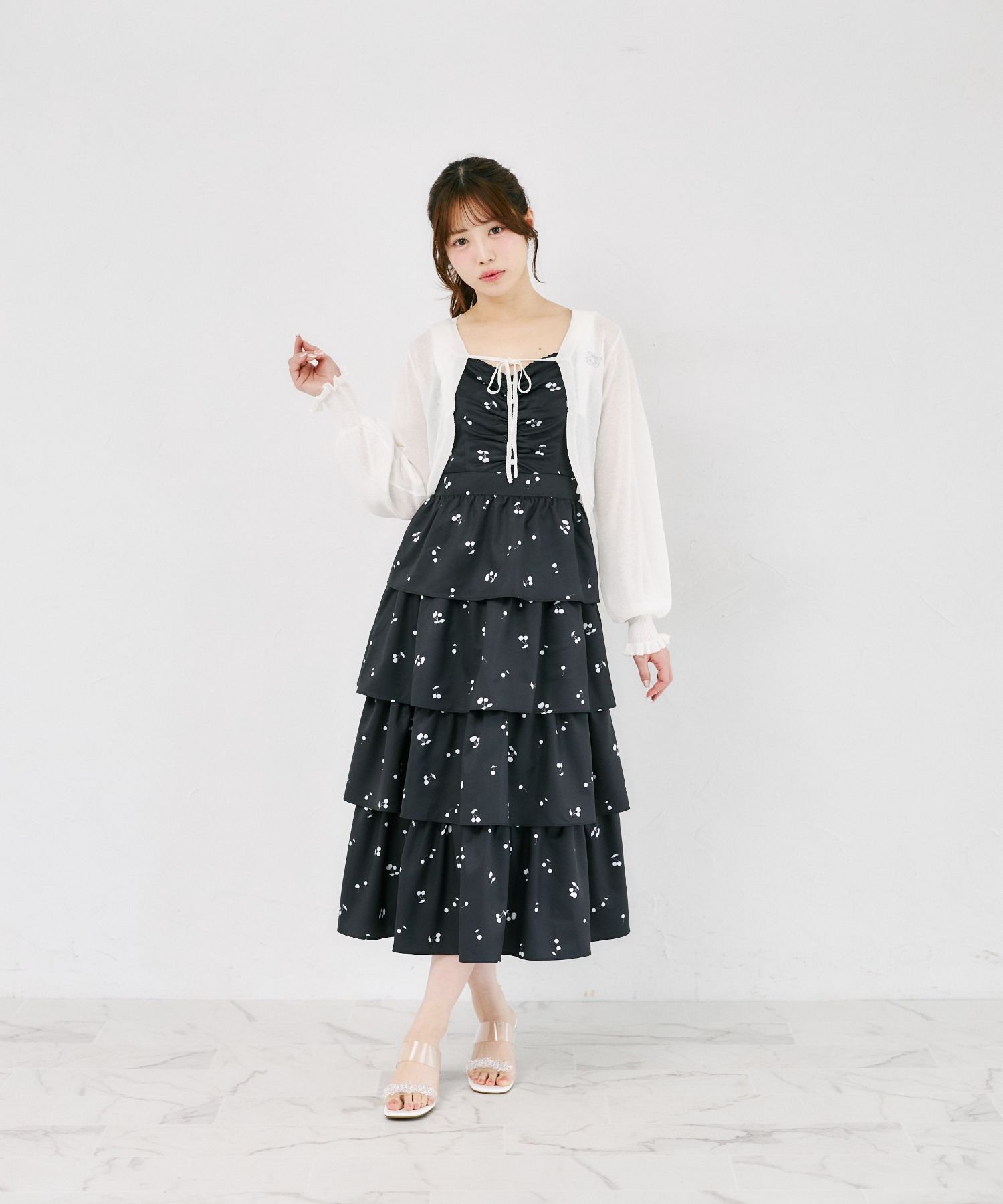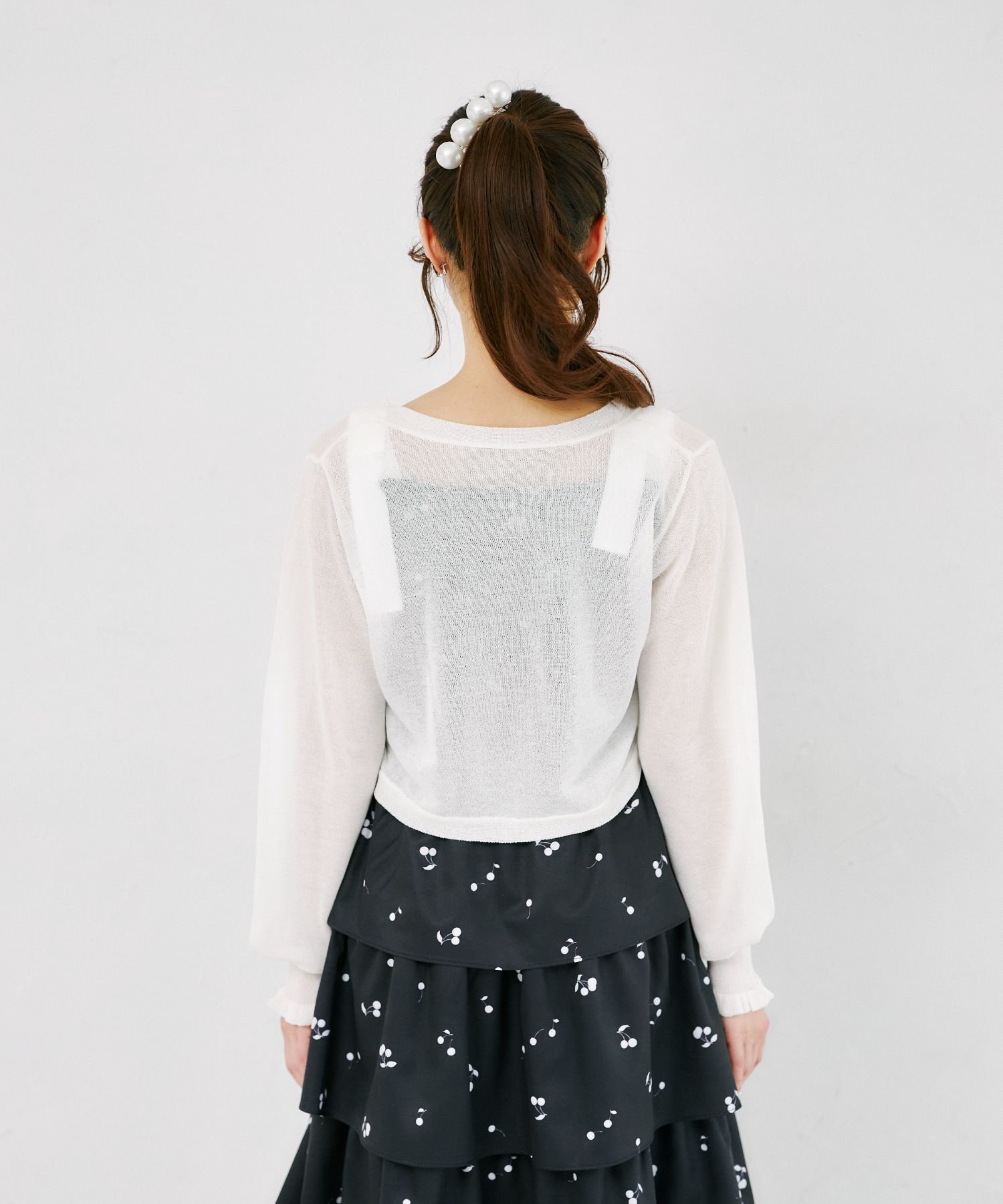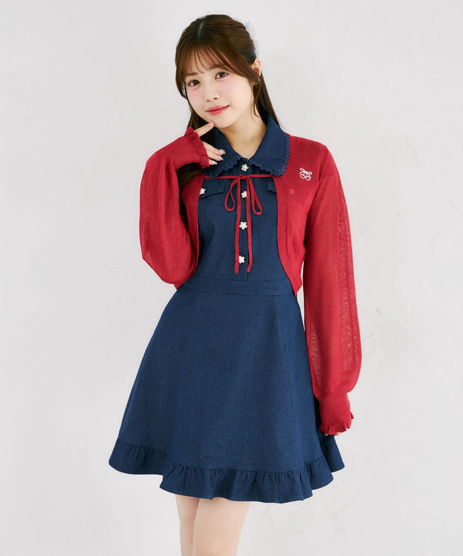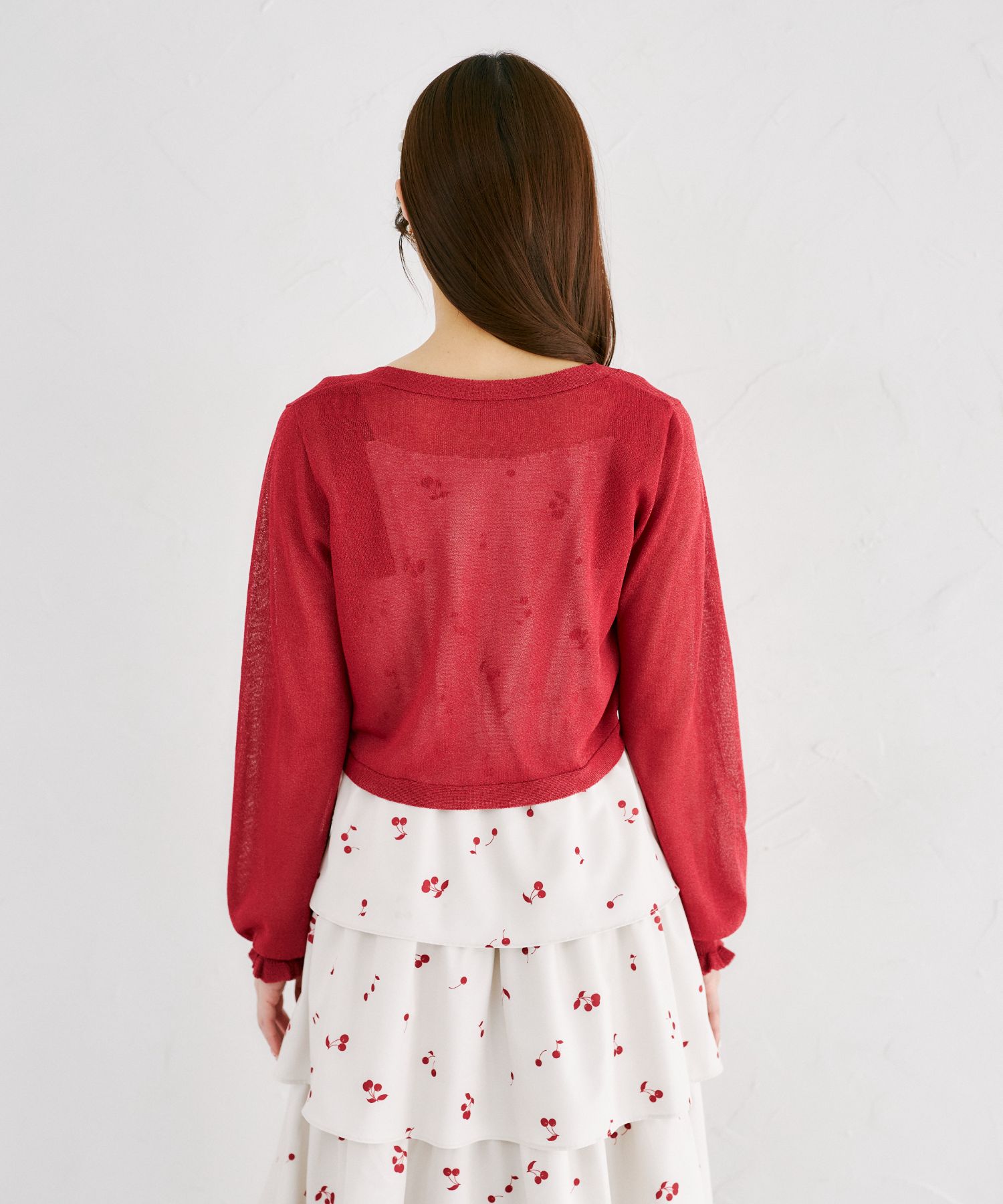 フロントのリボン、胸元のチェリー刺繍、袖口のフリル、