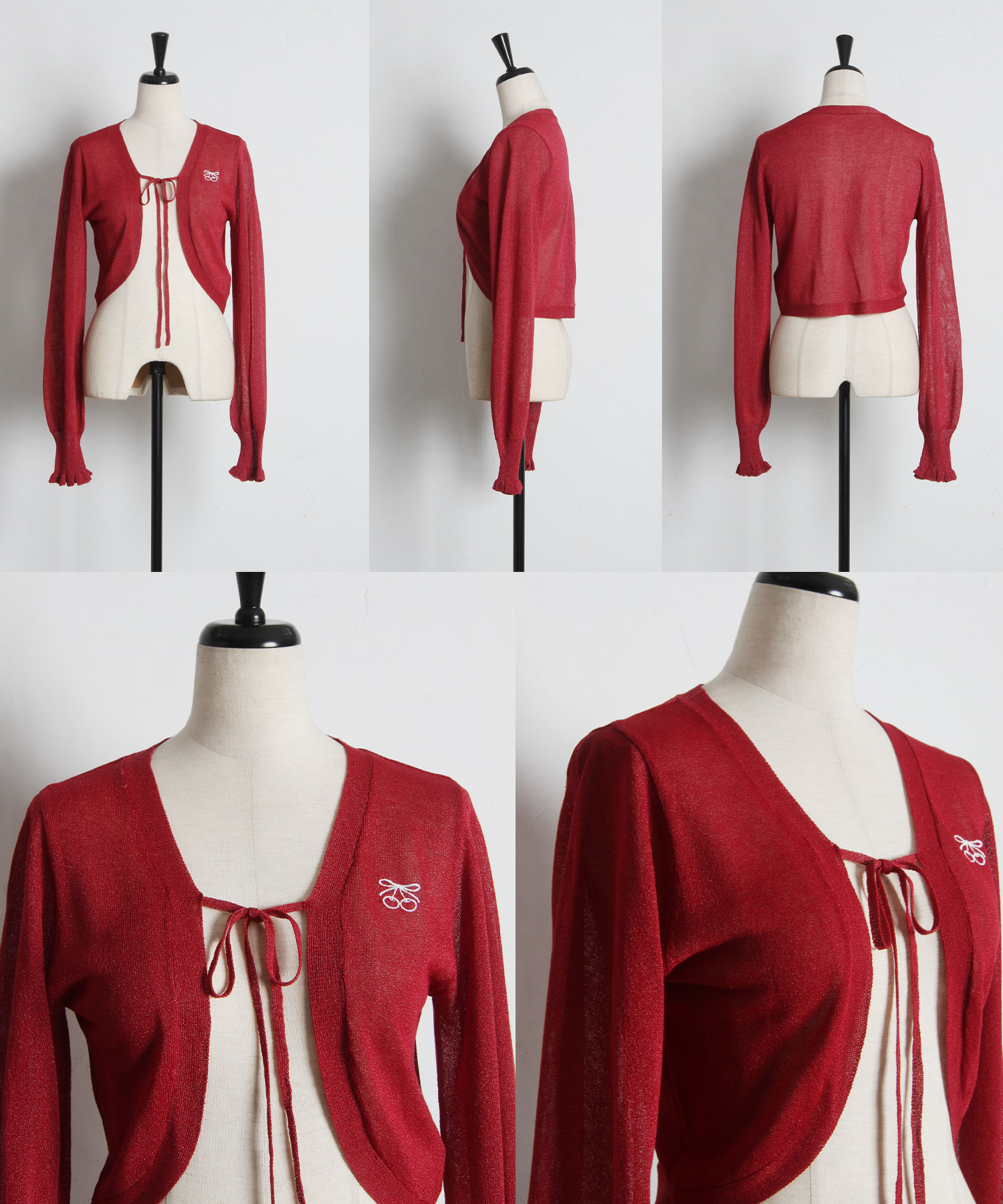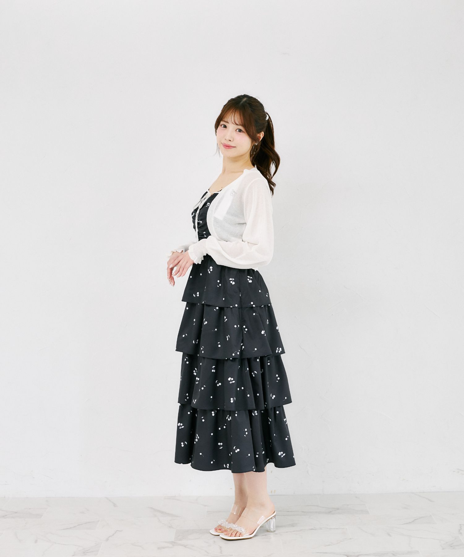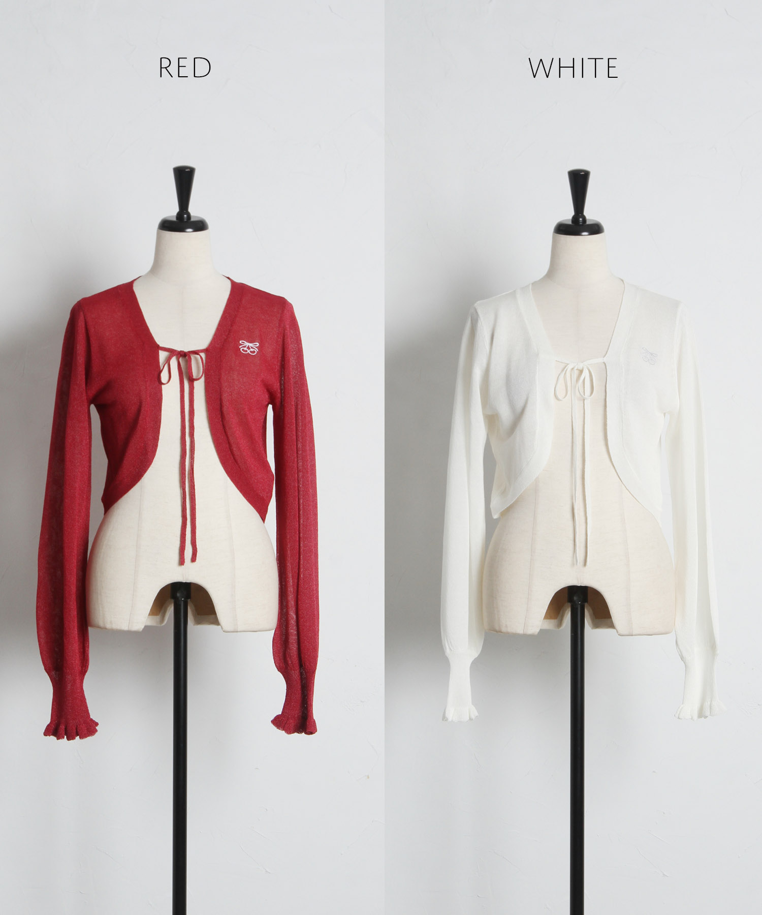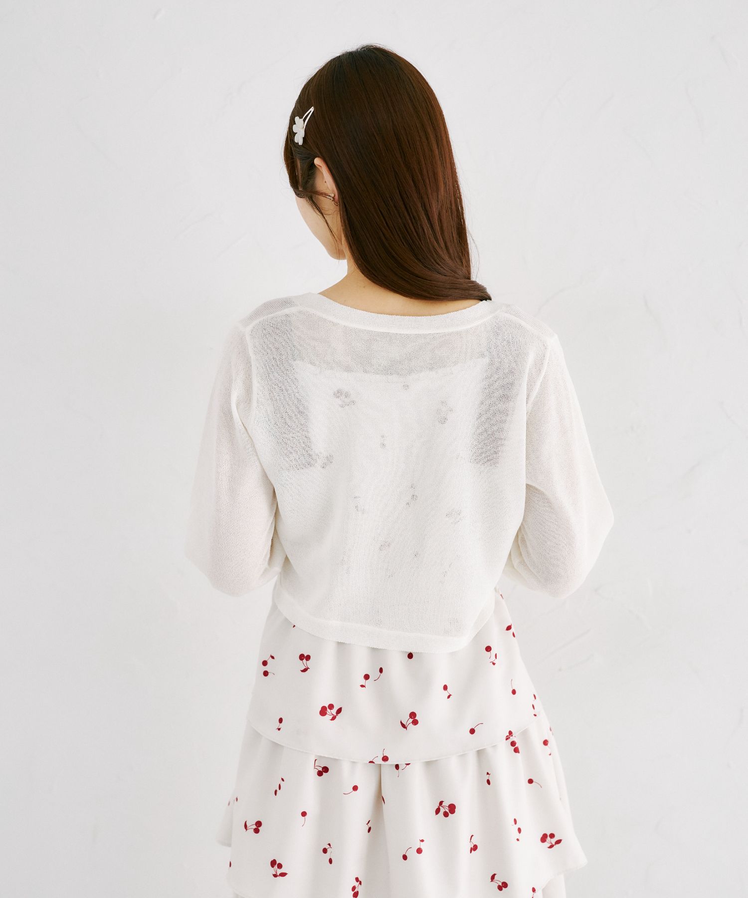 フロントのリボン、胸元のチェリー刺繍、袖口のフリル、